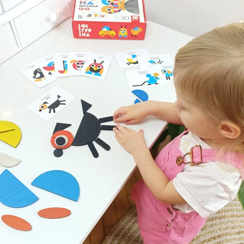 Vous voulez assembler une voiture, un oiseau ou un éléphant avec des cercles, des demi-cercles et des triangles ? Oui ! Ce jouet écologique est un super entraîneur pour le cerveau, les doigts et l’imagination des enfants. La mosaïque en bois colorée de la marque Igroteco se compose de 30 éléments, avec lesquels on peut former des images stylisées d’animaux, de plantes, d’objets du quotidien, de chiffres et de lettres, de formes géométriques et de motifs. Le kit comprend également 10 cartes colorées recto-verso avec des mosaïques intéressantes. En les plaçant, l’enfant peut inventer de nouvelles figures encore et encore. Ce processus passionnant est très bénéfique pour le développement de la motricité fine et de la pensée logique, de la coordination et de la compréhension des couleurs et des formes. Ce jouet développe :