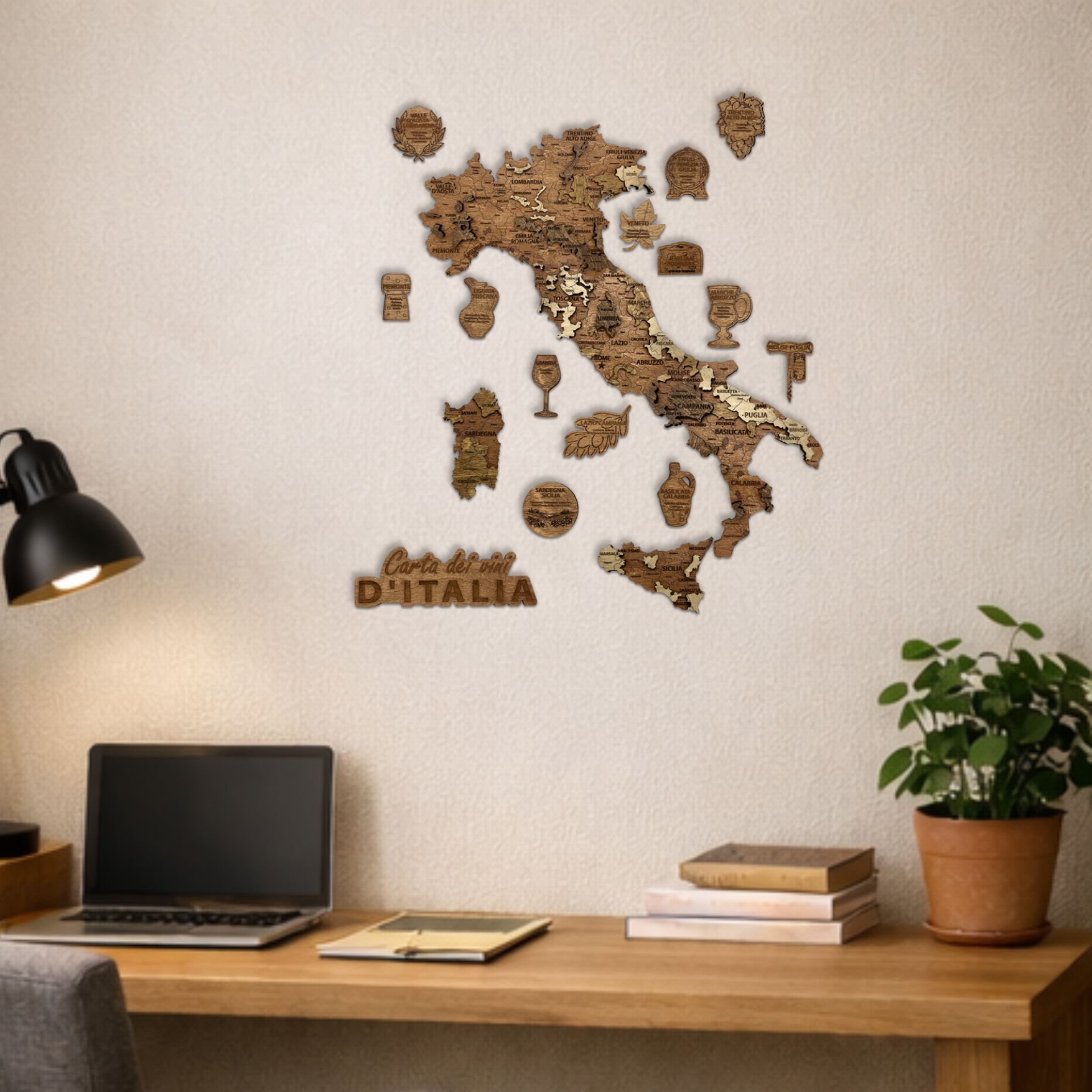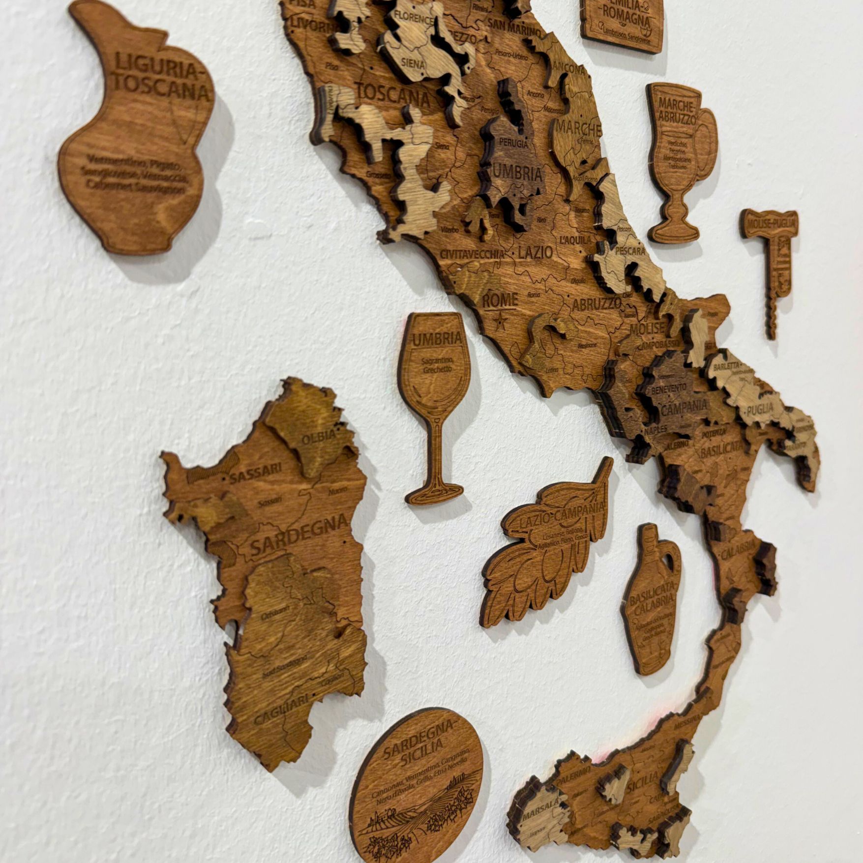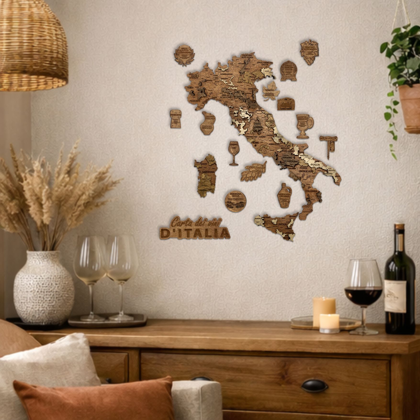 Fabriquée avec précision, cette carte murale en bois offre un rendu chaleureux et naturel qui s’intègre parfaitement dans une cuisine, un salon, un bar à vin ou une cave. Elle permet de découvrir visuellement les grandes régions viticoles italiennes tout en apportant une touche raffinée à votre intérieur.