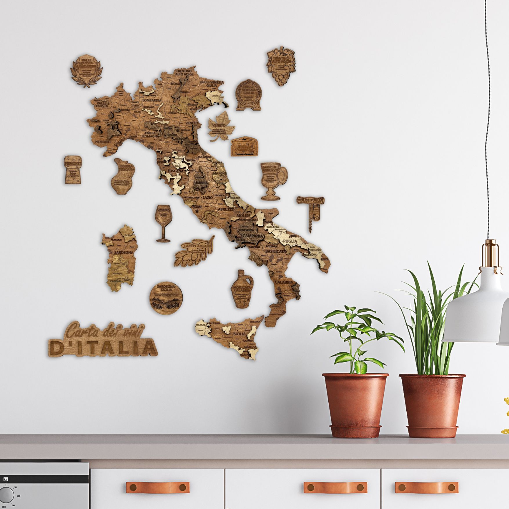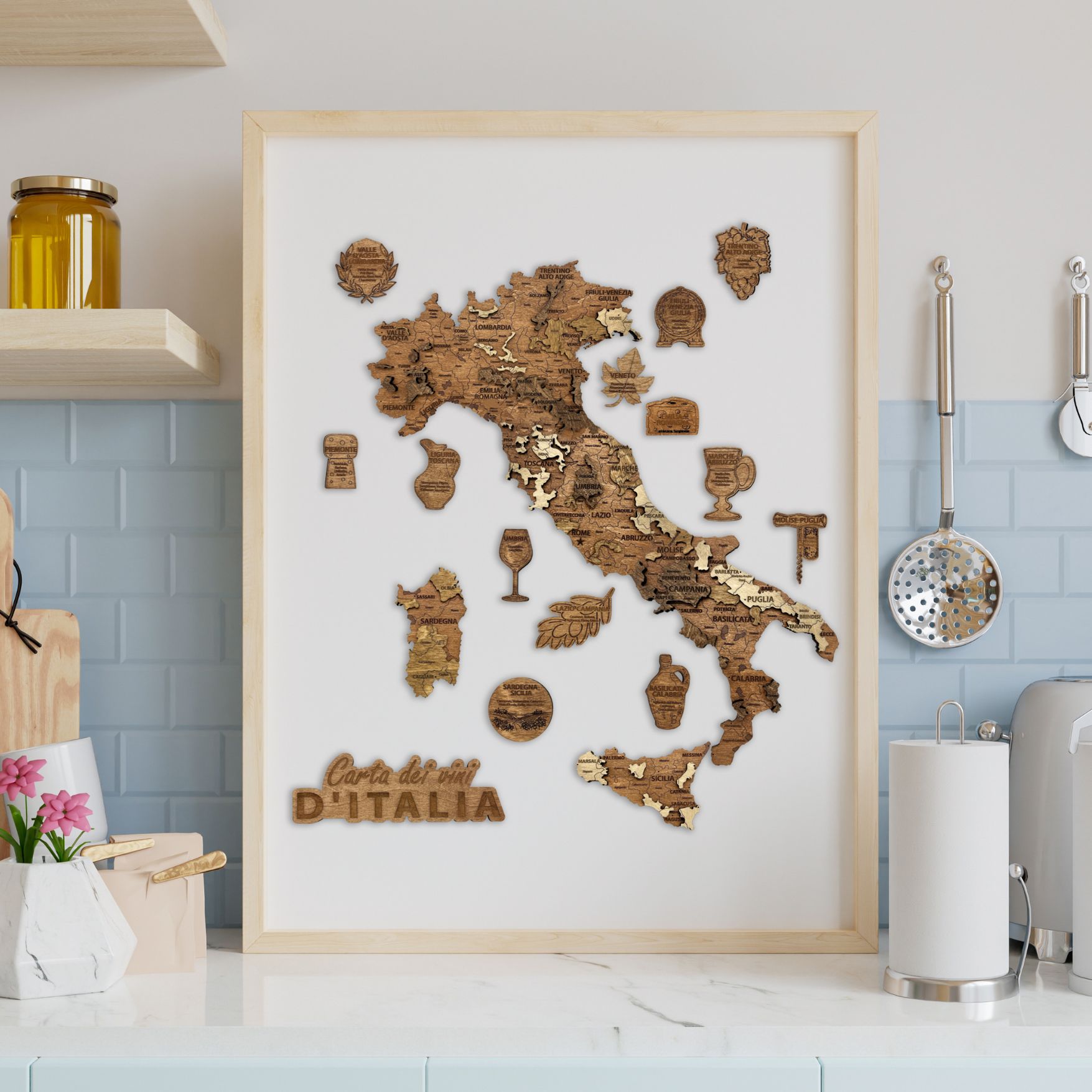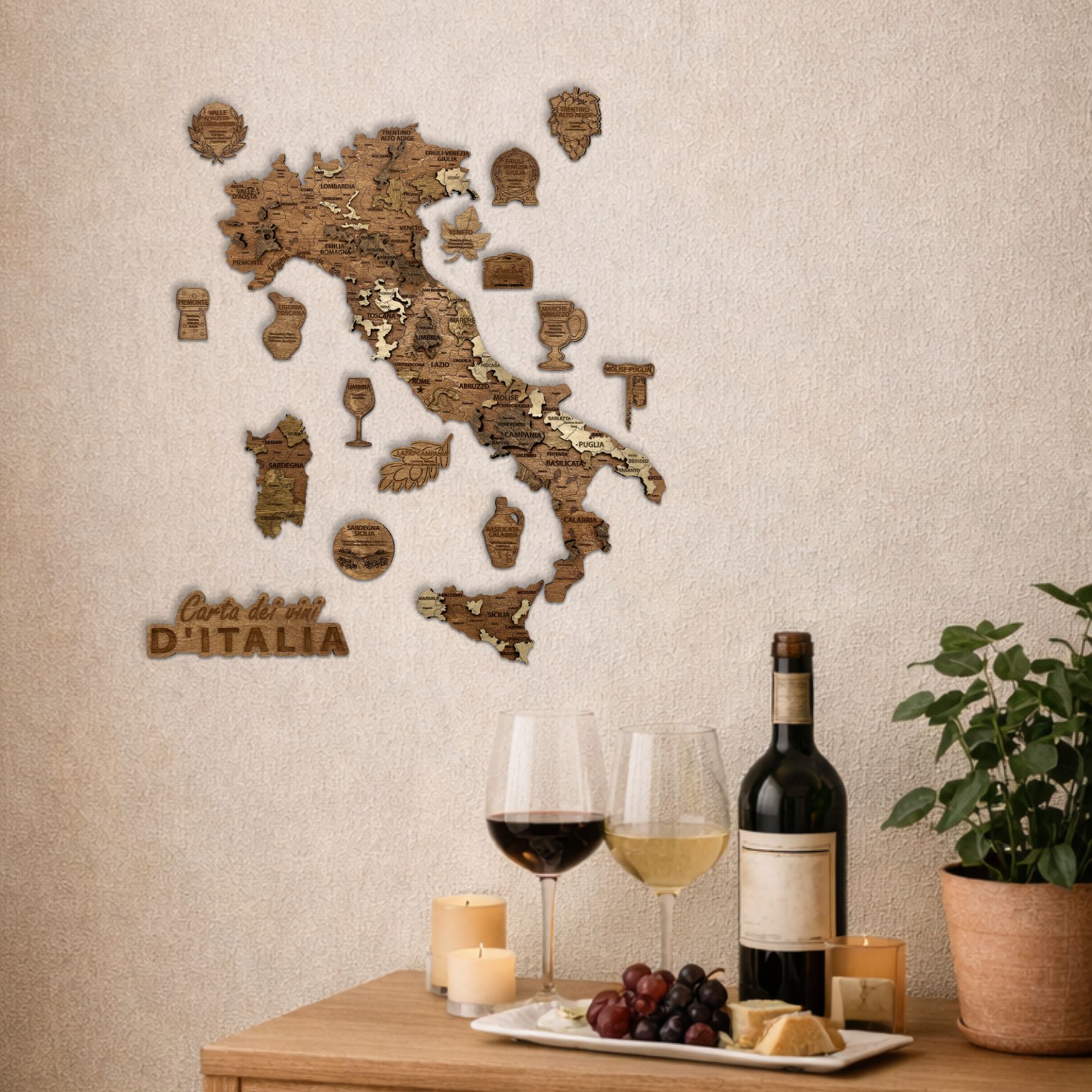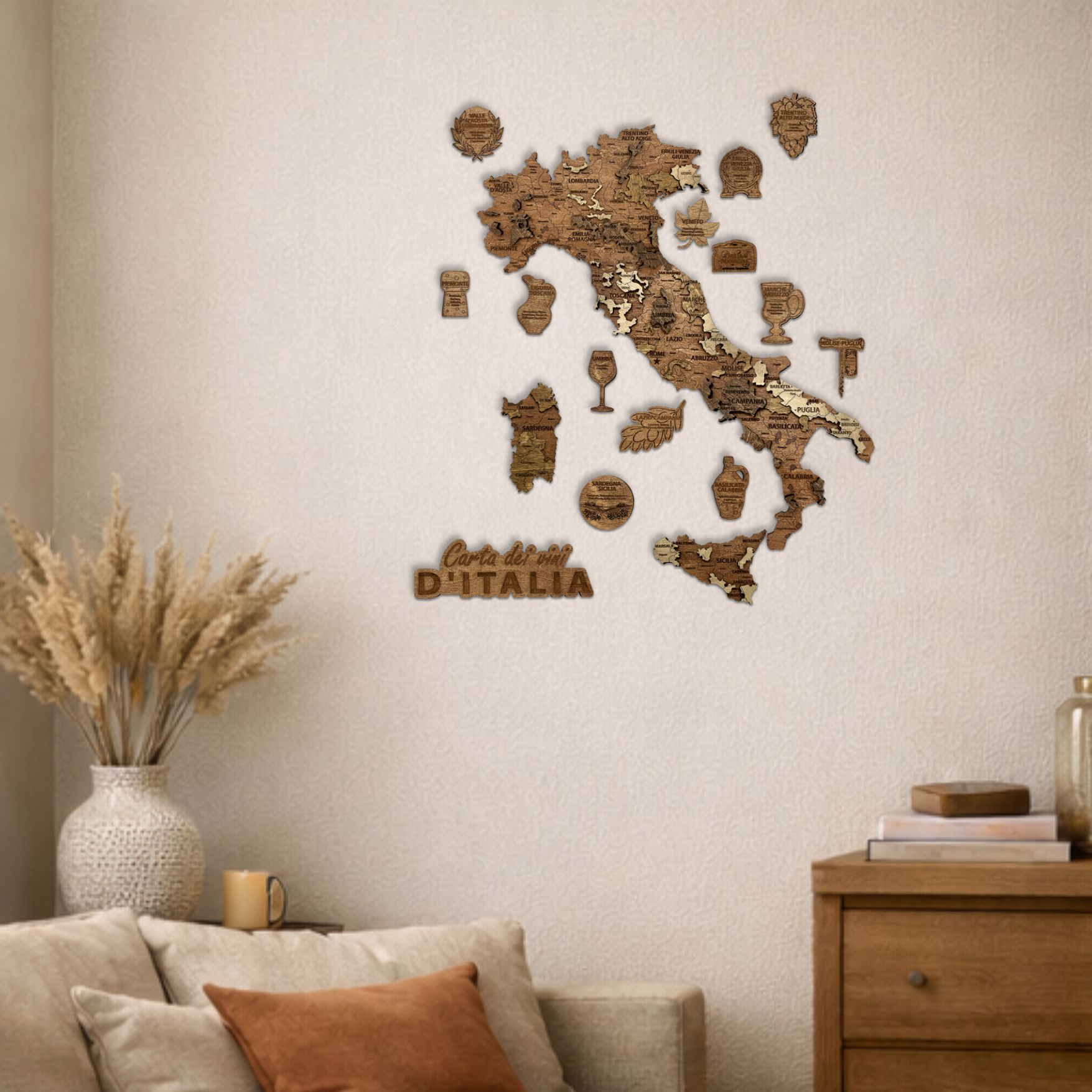 Fabriquée avec précision, cette carte murale en bois offre un rendu chaleureux et naturel qui s’intègre parfaitement dans une cuisine, un salon, un bar à vin ou une cave. Elle permet de découvrir visuellement les grandes régions viticoles italiennes tout en apportant une touche raffinée à votre intérieur.