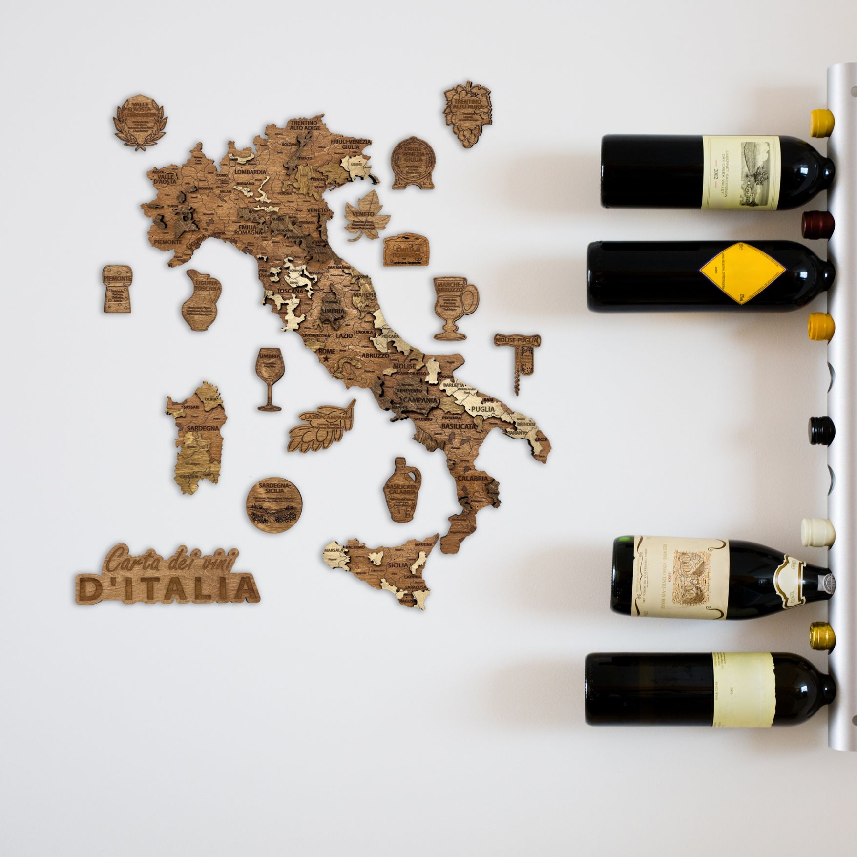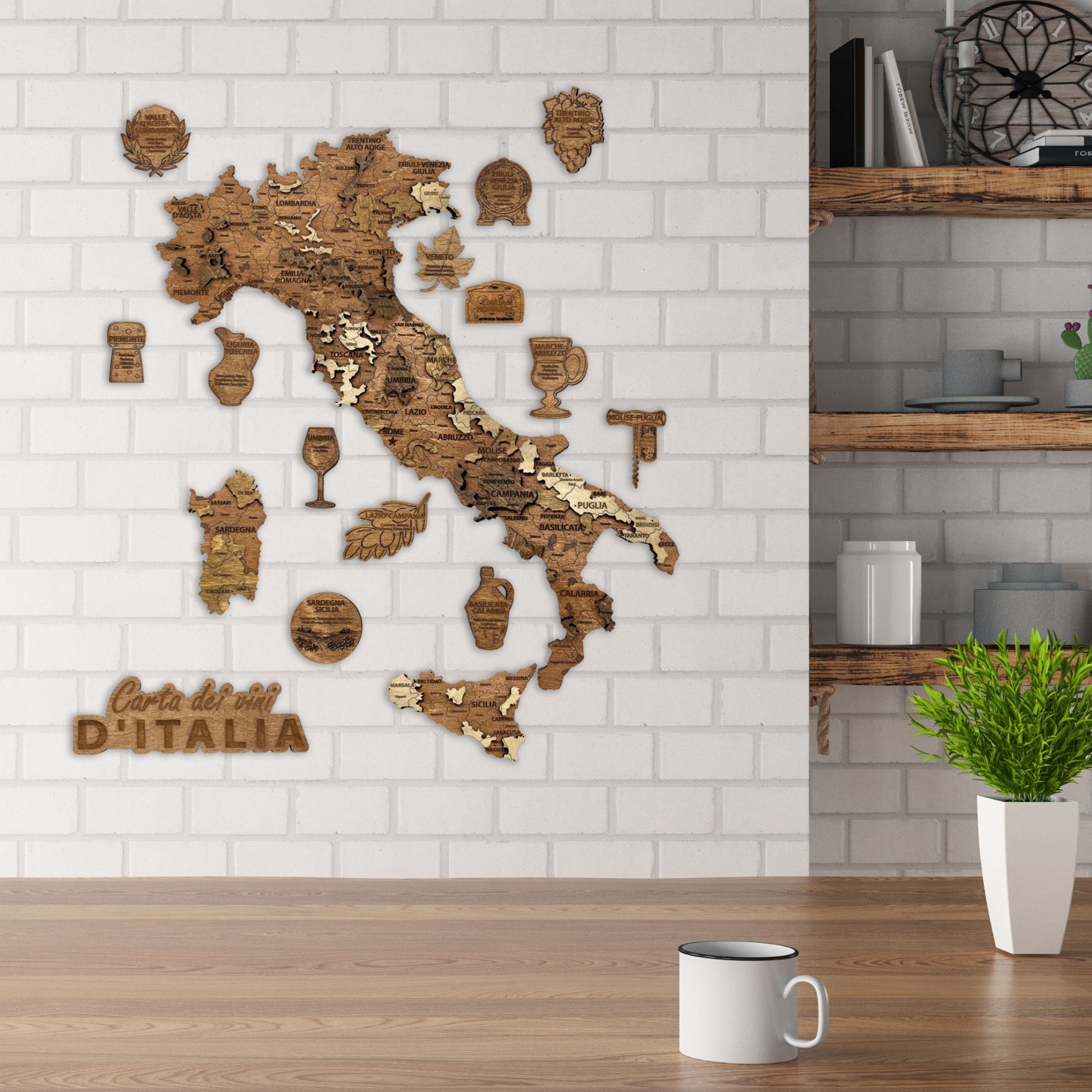Découvrez la richesse du terroir italien avec cette carte des vins d’Italie en bois, une pièce décorative unique qui combine design, culture et passion pour l’œnologie. Cette carte élégante met en valeur les principales régions viticoles d’Italie et constitue un élément décoratif idéal pour les amateurs de vin et les passionnés de gastronomie italienne.
