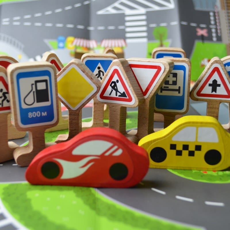 L’ensemble de jeu “Panneaux de signalisation” pour enfants est une excellente occasion de combiner l’apprentissage des règles simples de la circulation routière avec un jeu passionnant de voitures. Collez les autocollants sur les panneaux de signalisation, disposez-les le long des routes et partez en voyage à travers la ville !