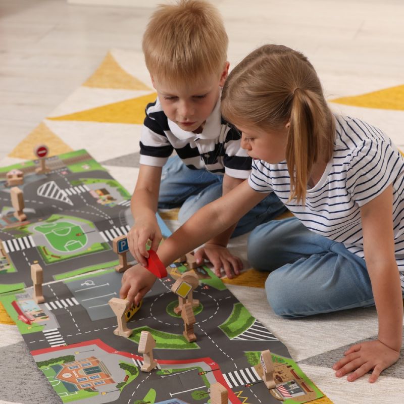 À la demande de l’enfant, il peut assembler les routes les unes aux autres et créer une ville entière, longue de près de 2 mètres ! Ce jeu intéressera à la fois les enfants qui peuvent conduire leurs voitures préférées dans la ville, s’arrêter aux passages pour piétons, étudier les couleurs des feux de circulation, ainsi que les enfants plus âgés qui commenceront à se familiariser avec les règles de base de la circulation et du comportement dans les rues de la ville sous forme de jeu.
