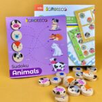 •Des jetons en bois illustrés avec 4 types d’animaux : renard, chien, vache et ours.