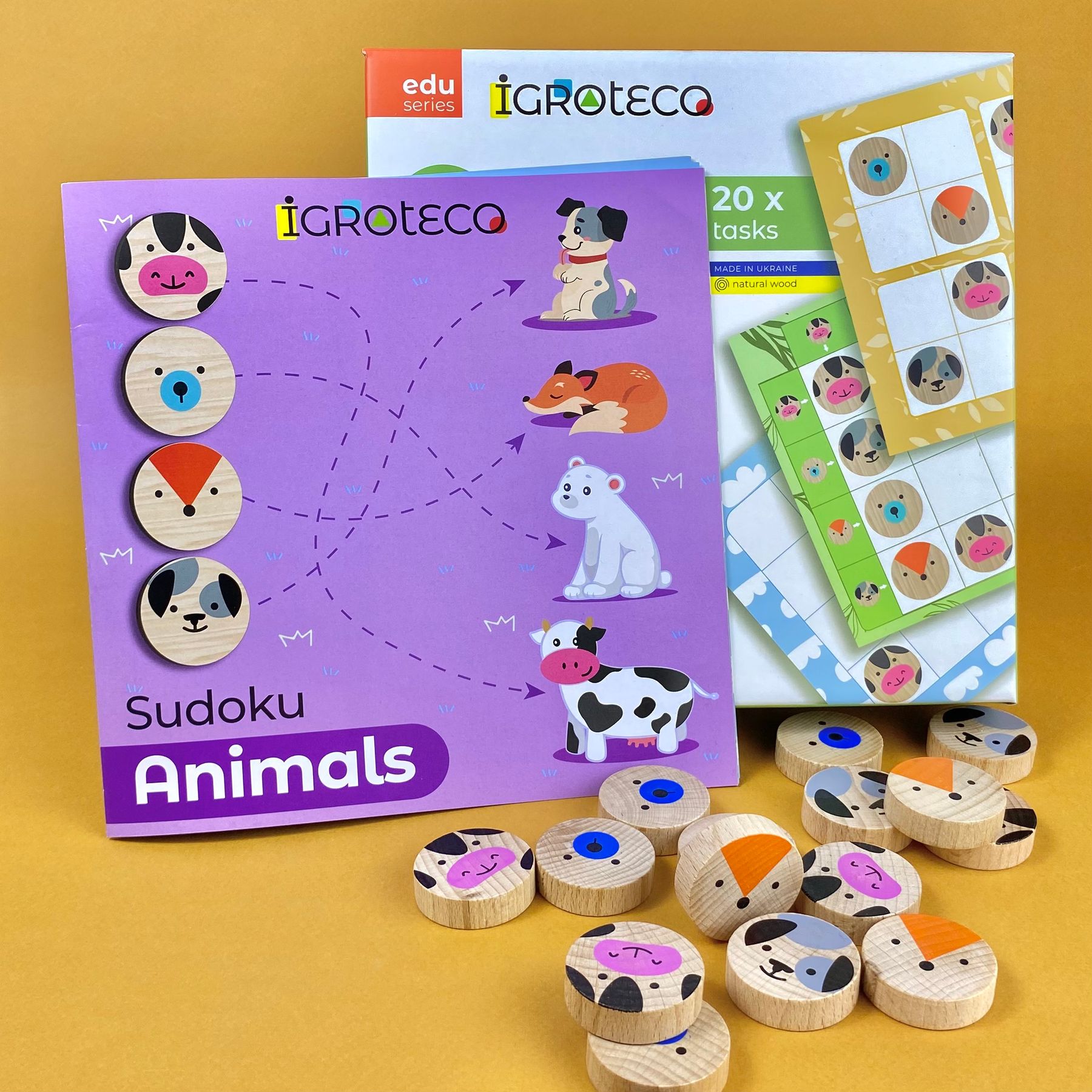 SUDOKU Animaux est une version adaptée où l’objectif est de placer des jetons avec des images d’animaux dans une grille de 4×4, de manière à ce que chaque jeton n’apparaisse qu’UNE SEULE fois dans chaque ligne horizontale et verticale.